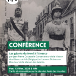 Chers Amis, n’oubliez pas, le 13 février, à l’auditorium du Palais des Beaux-Arts, une conférence qui clôturera cet événement qui a fait venir 80000 visiteurs au musée des Beaux-Arts. L’histoire des Géants. Issus de nos régions, ils peuplent depuis des décennies nos villages et nos villes. JP Ducastelle, conservateur du musée des Géants d’Ath (belgique) vous évoquera cette histoire et son engagement pour l’inscrire au patrimoine de l’UNESCO Vendredi 13 février 19 h, via l’entrée arrière du Palais des Beaux-Arts, 18 bis rue de Valmy, Lille. Réservation en ligne sur le site des Amis ou en cliquant sur ce LIEN.Possibilité de payer sa place à l’entrée si vous anticiper votre venue.(chèque ou espèces) |